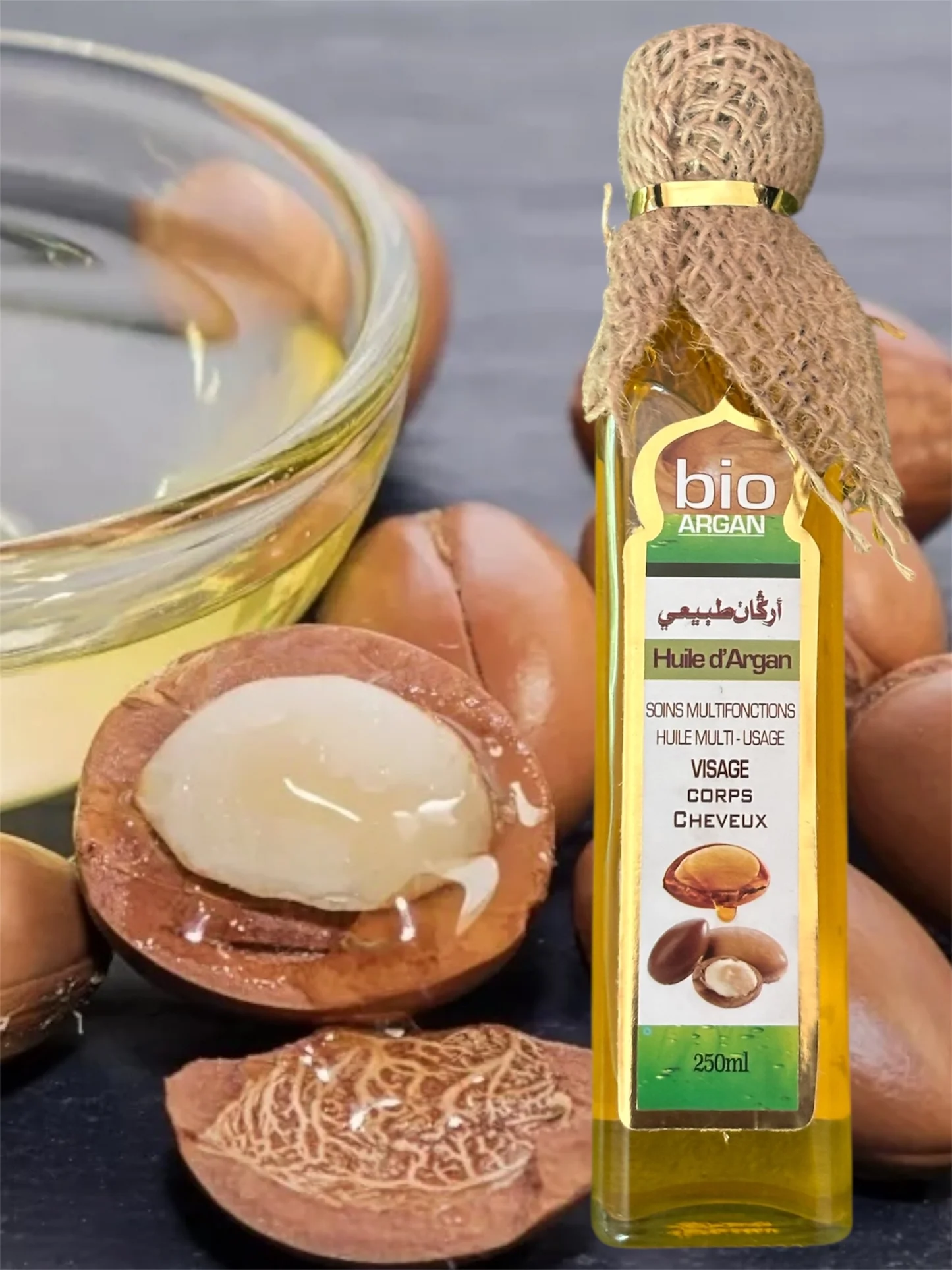 - Aceite de argán 100% puro y natural, extraído en frío de las nueces de argán.