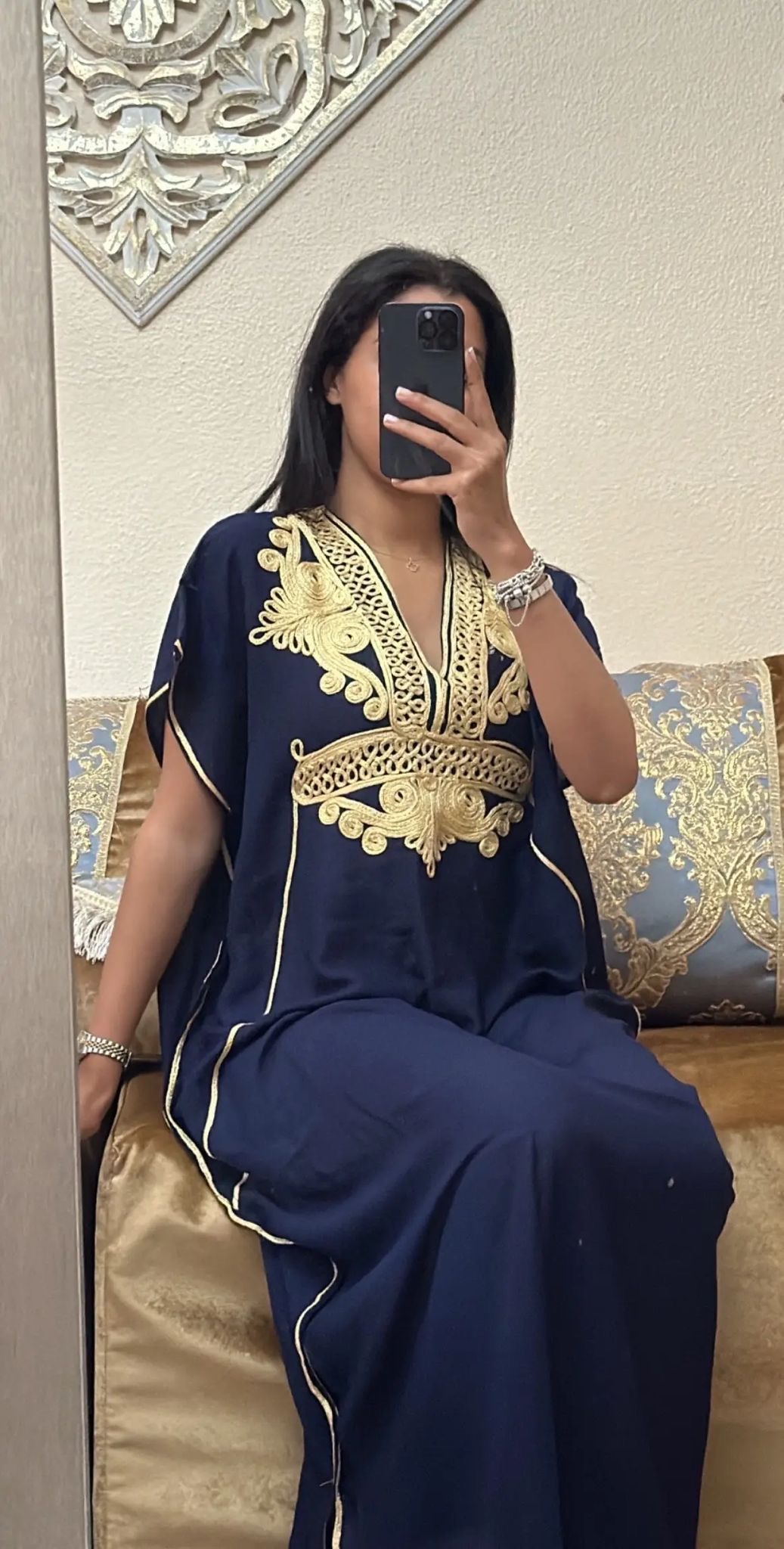Preciosa chilaba / gandoura de mujer con un fino bordado dorado en el pecho, esta gandora marroquí esta hecho de una tela de algodón ligera, suave y cómoda de llevar.
