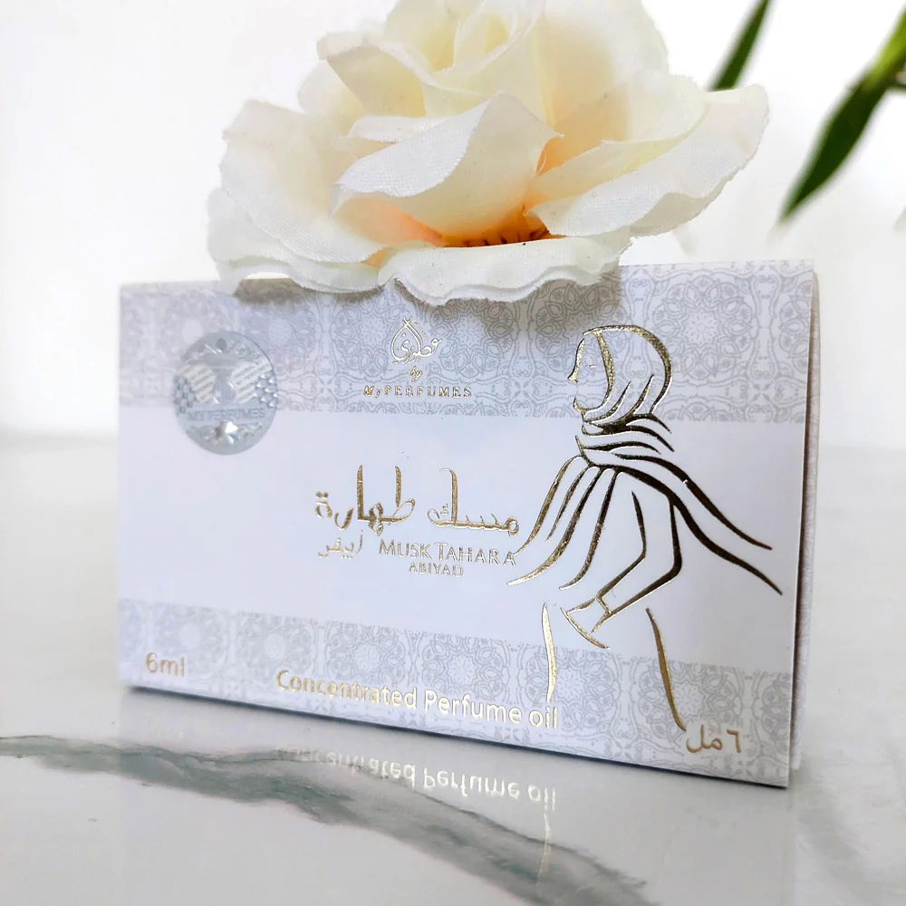 El producto en la imagen es un aceite de perfume concentrado llamado «Musk Tahara Abiyad» de la marca My Perfumes.